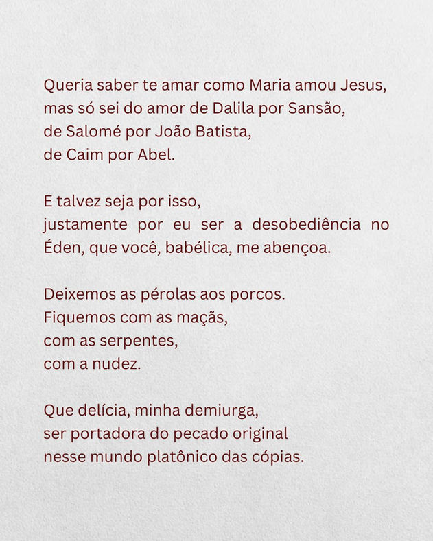Escritas à mão em guardanapos rendados, as poesias transformam o gesto doméstico em um campo de investigação poética sobre o instinto e o vínculo, revelando que o amor, em qualquer espécie, é sempre um território de conflito e metamorfose.