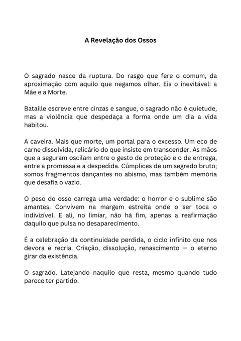 "Zoon Erotikon" é um mergulho no abismo onde o corpo e o símbolo se encontram. As mãos de minha mãe se tornam o palco de um ritual silencioso, manipulando ossos, penas e olhos para questionar o que resta do animal em nós. A série é acompanhada por um ensaio em nove movimentos, uma colagem de reflexões poéticas e filosóficas sobre a beleza do inútil, a potência da ausência e a herança da mortalidade. A obra propõe um diálogo entre a imagem e a palavra para explorar a condição de 'animal erótico': um ser definido não pela força, mas pelo desejo de olhar para dentro do vazio e encontrar ali, na própria falta, a pulsação incessante da vida.
